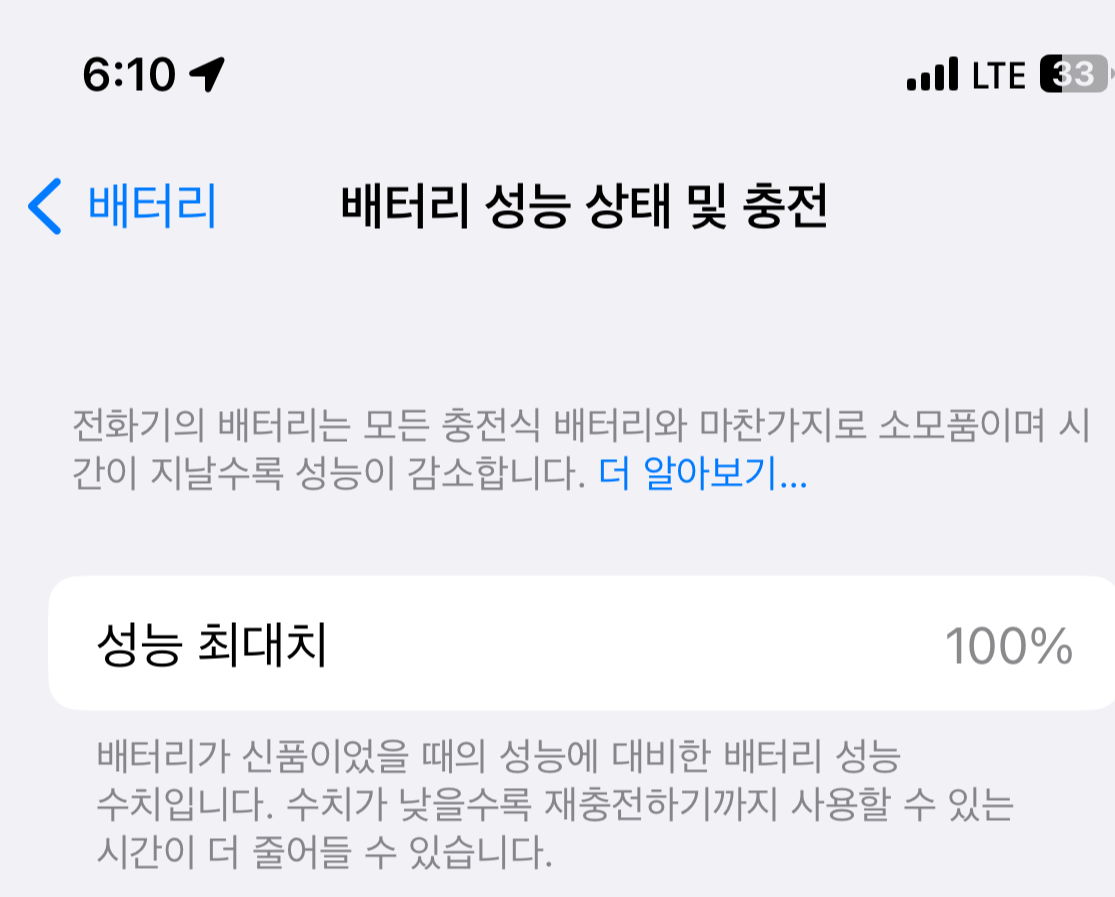 드디어 배터리 성능 상태가 100%가 되었습니다! 야호!