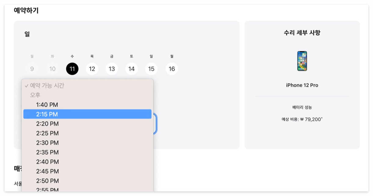 그러면 이렇게 아이폰 수리가 가능한 날짜와 예약 가능한 시각이 뜹니다!
