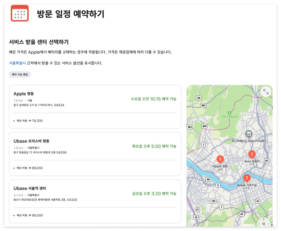 그래서! 오늘은 배터리를 교체해보러 배터리 교체 예약을 하고 명동 애플 스토어를 예약해보았습니다!
