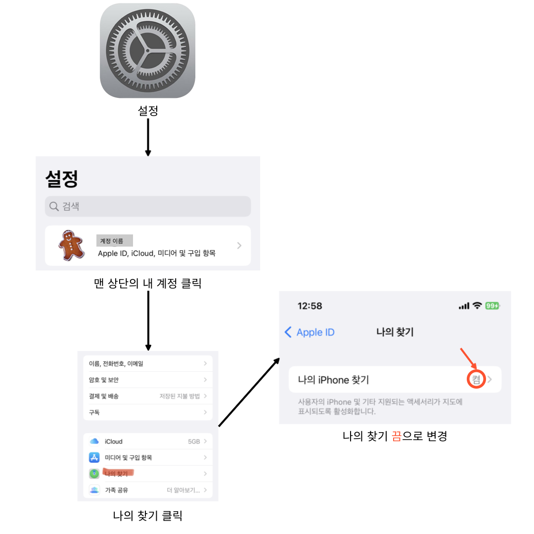 이 시간 동안 애플 나의 찾기를 off 하라고 하더라구요!